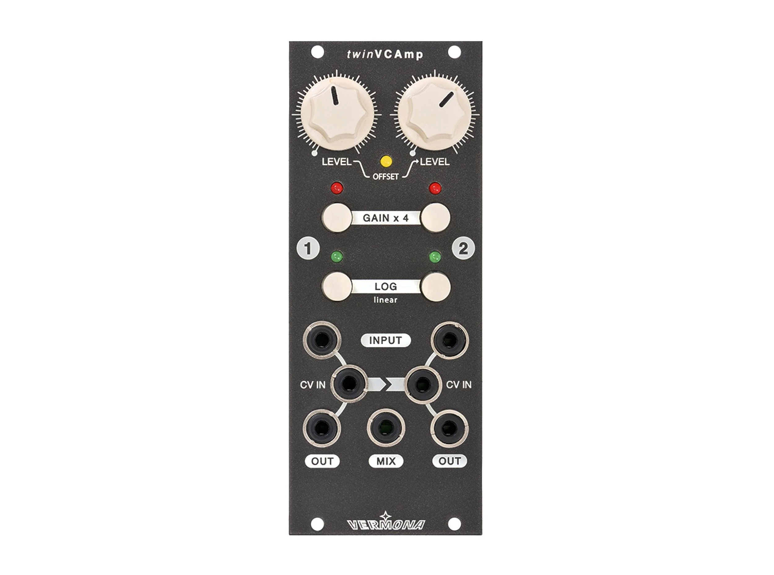 Vermona’s twinVCAmp is a versatile and pristine VCA with through-out circuitry that gives it exemplary sonic characteristics. The amplification ratio of each VCA can be set individually to either 1:1 or 1:4, meaning that users can amplify any signal no matter how strong or weak it is. Additionally, the module is capable of distorting harmonic signals in a manner that can only be described as inherently musical. Along those lines, each VCA can be independently set to an exponential or semi-logarithmic curve, enabling use for a wide variety of different sonic applications.