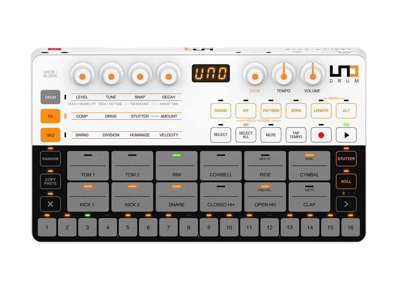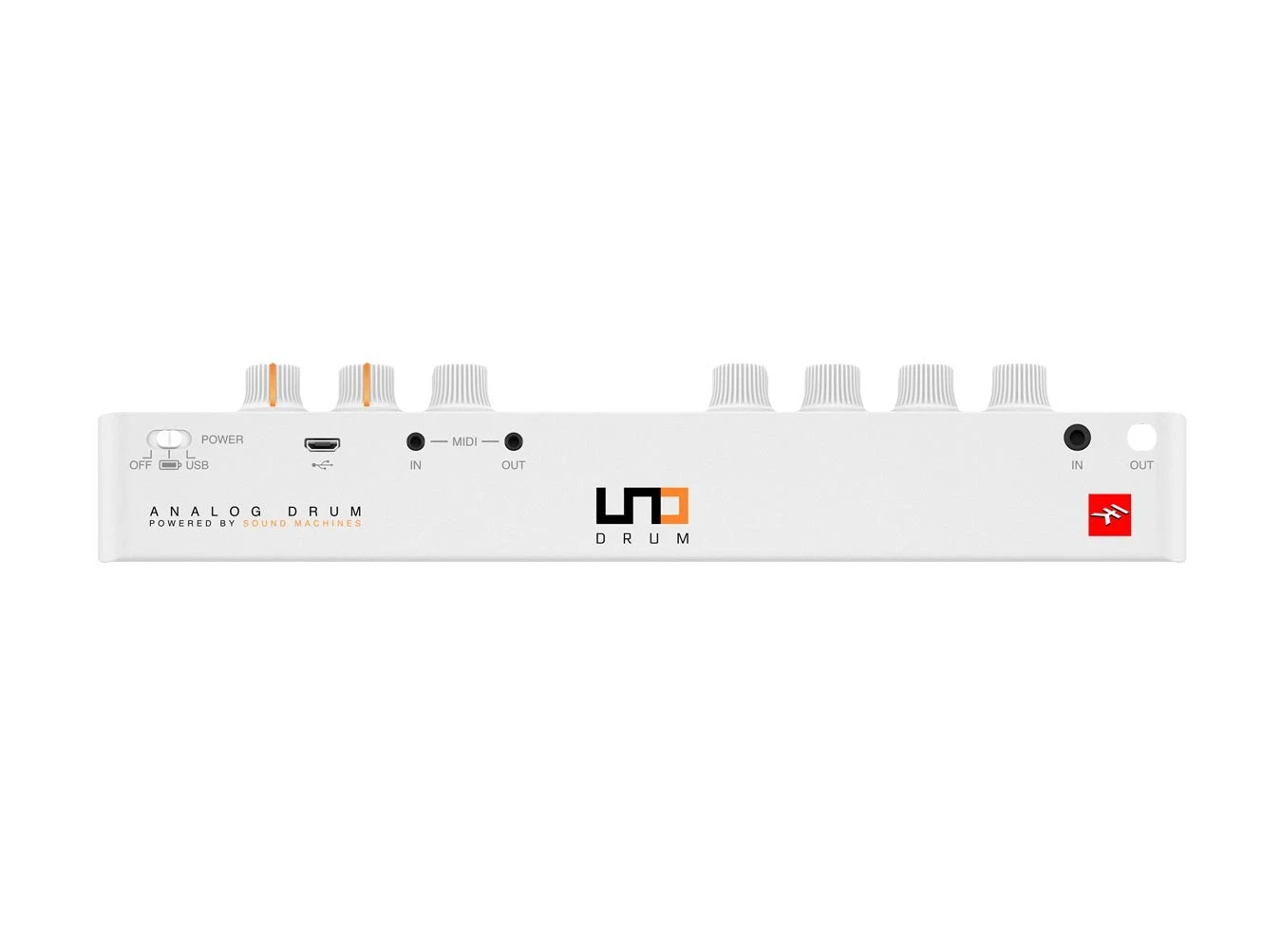 The IK Multimedia UNO Drum is a hybrid analog and digital drum machine, made in collaboration with Sound Machines. It features six analog voices and 54 PCM samples, which can be saved into 100 kits. The step-sequencer can save up to 100 user patterns. These can be up to 64 steps long and can be chained together in song mode. Parameter sequencing is also available with up to eight parameter changes per step. It is MIDI controllable, with MIDI in and out on 2.5mm jacks and micro-USB. The built-in effects include a compressor, drive, and stutter effect. External audio can be run into the UNO Drum and processed through the compressor. Sequencer effects include swing, humanize, roll, fill, and random. It can be powered from a laptop, battery, or USB power. The UNO Drum is a lo-fi drum machine that is fun and has a range of sounds and sequencing options.