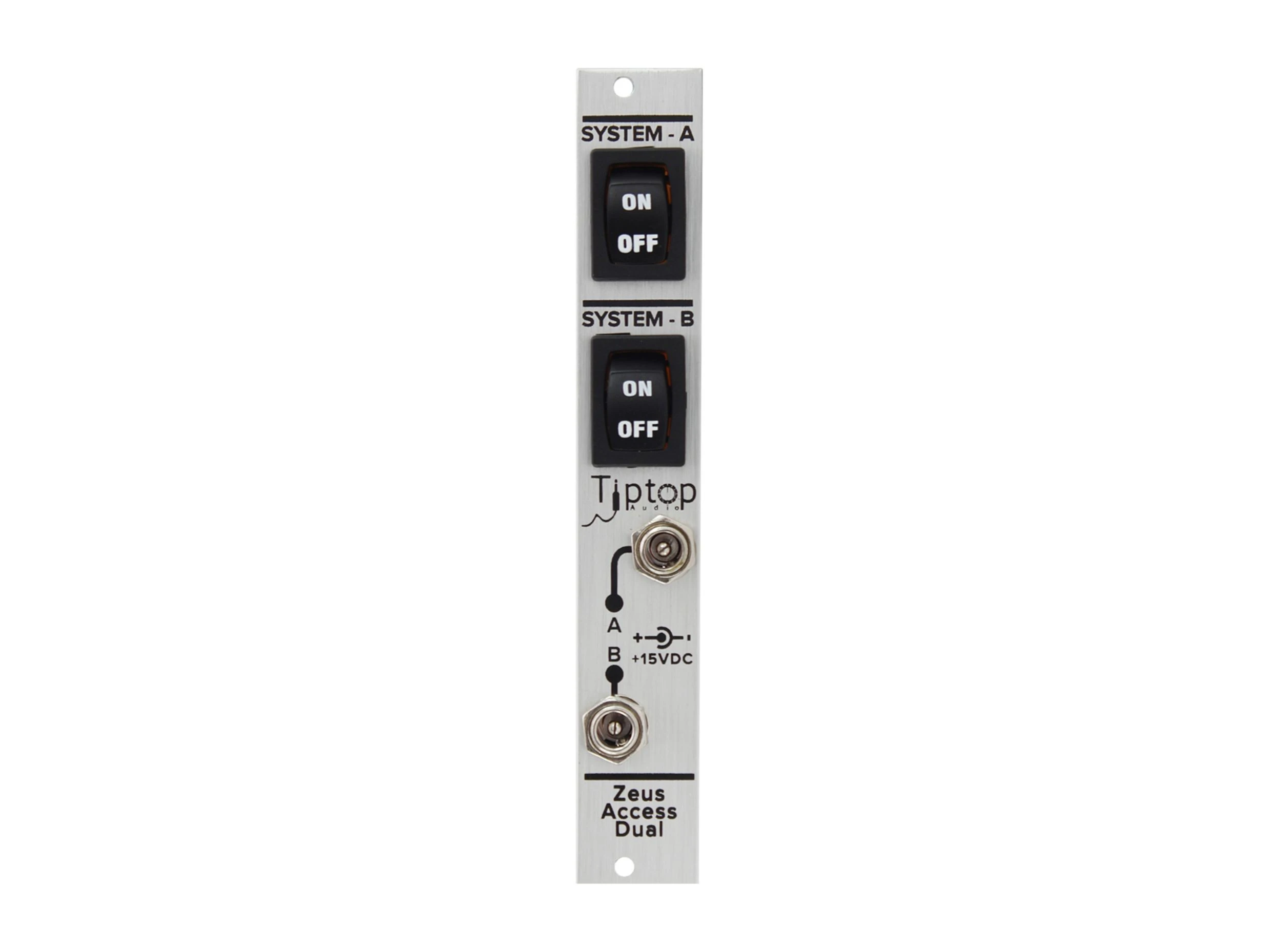 The Zeus Access Dual is Tiptop Audio’s miniature panel for their Zeus Systems that allows users to connect up to six Zeus Studio boards and two Cincon-TTA power bricks. At 4HP, the module is a compact and convenient way to power large Eurorack systems.